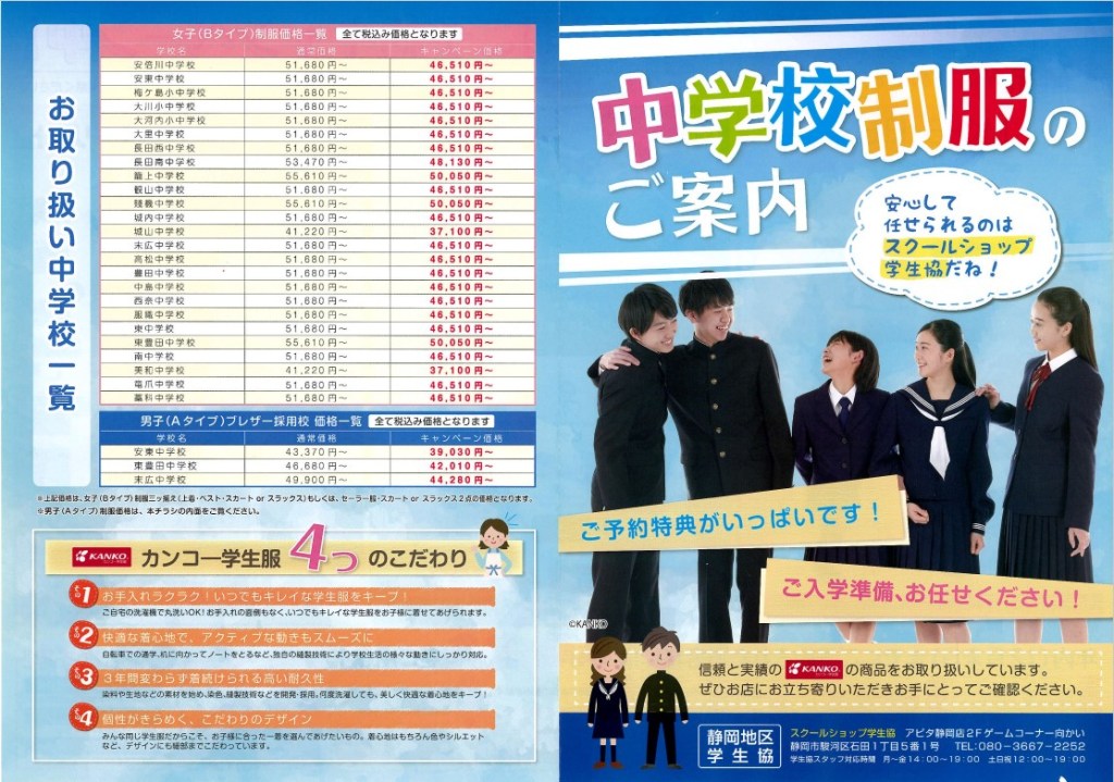 | ◎「3,000円 学生協商品券」進呈! ・ただし、夏冬両セット購入で、男子はドライウオッシュ限定 (ブレザーの東豊田、安東、末広中は、夏冬両セット購入でOK) ・ベストなし及びセーラー服の場合は2,000円の学生協商品券 +卒業式用レンタルブレザー他、無料 学生協商品券は教育サービスの販売・売店・広野営業所でお使いいただけます。 |